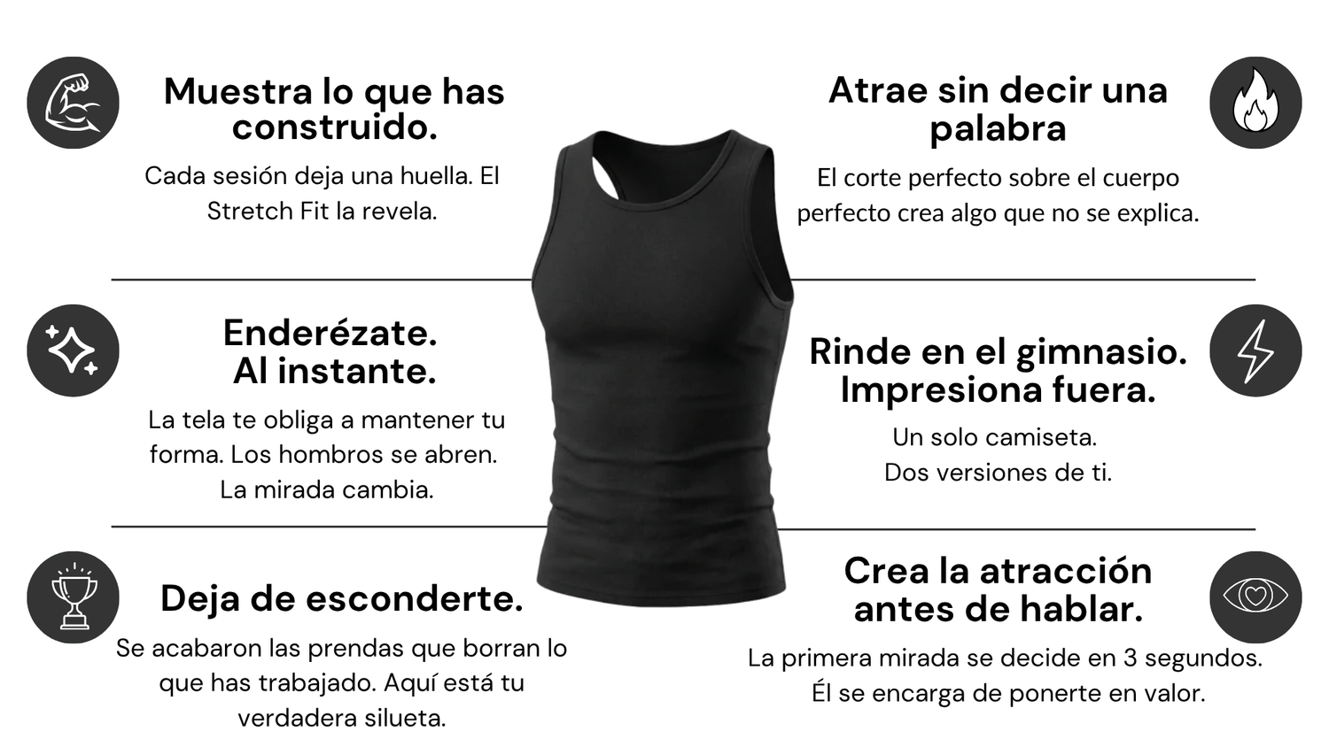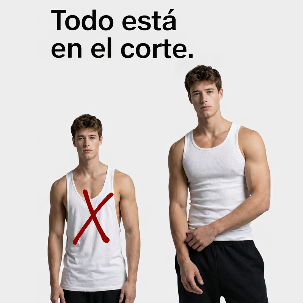 Un tirantes demasiado abierto en las axilas, demasiado caído en el pecho y hasta el mejor físico desaparece. El corte lo es todo. Sube los hombros, define el torso, cubre exactamente donde debe. No es cuestión de cuerpo. Es cuestión de corte.